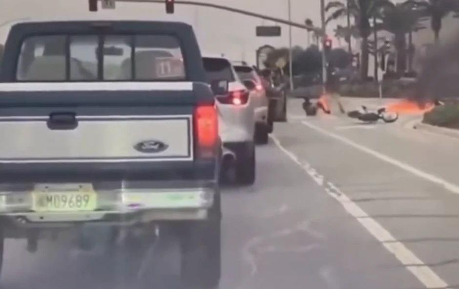 Šokantan incident zabeležen je na raskrsnici u Salinasu u Kaliforniji, kada je tinejdžer udario u bok automobila koji je skretao, izazvavši eksploziju i požar. Motor, automobil i tinejdžer odmah su se zapalili, dok je prijatelj vozača odmah pritrčao da mu pomogne da ugasi plamen.
