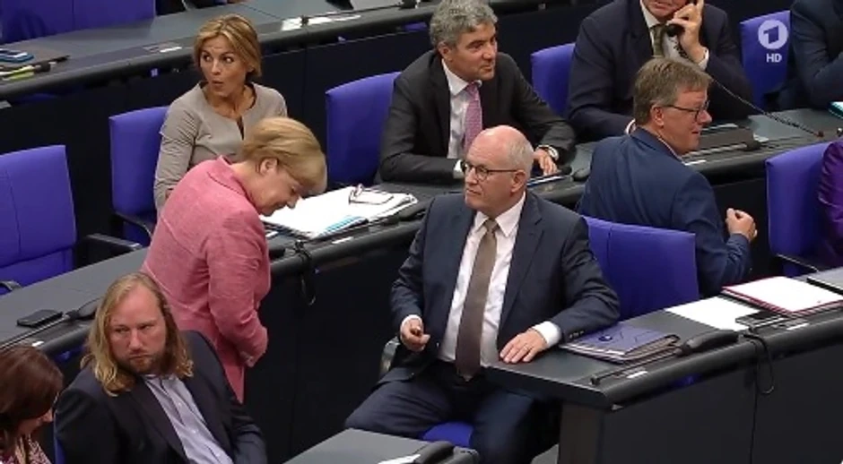 Nakon što je sa svojim stranačkim kolegom preglasno diskutovala tokom izlaganja jedne od poslanica, Norbert Lamer, predsednik Bundestaga, prekinuo je govor i poslao kancelarku i njenog partijskog saborca u zadnje redove, uz komentar: "Ne ide to tako, gospođo Merkel".