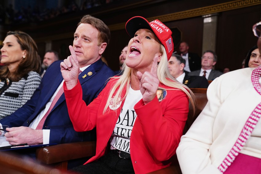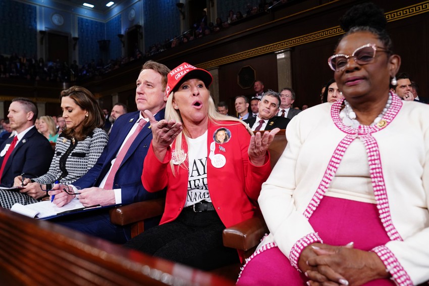 Krajnje desničarska republikanska kongresmenka Mardžori Tejlor Grin, kao i prethodnih godina, ubedljivo najviše je prekidala Bajdena, a kada je lider SAD ušao u salu na glavu je stavila crveni kačket sa natpisom "učinimo Ameriku ponovo velikom“, koji je postao jedan od zaštitnih Trampovih simbola. Na sebi je imala i crveni blejzer.