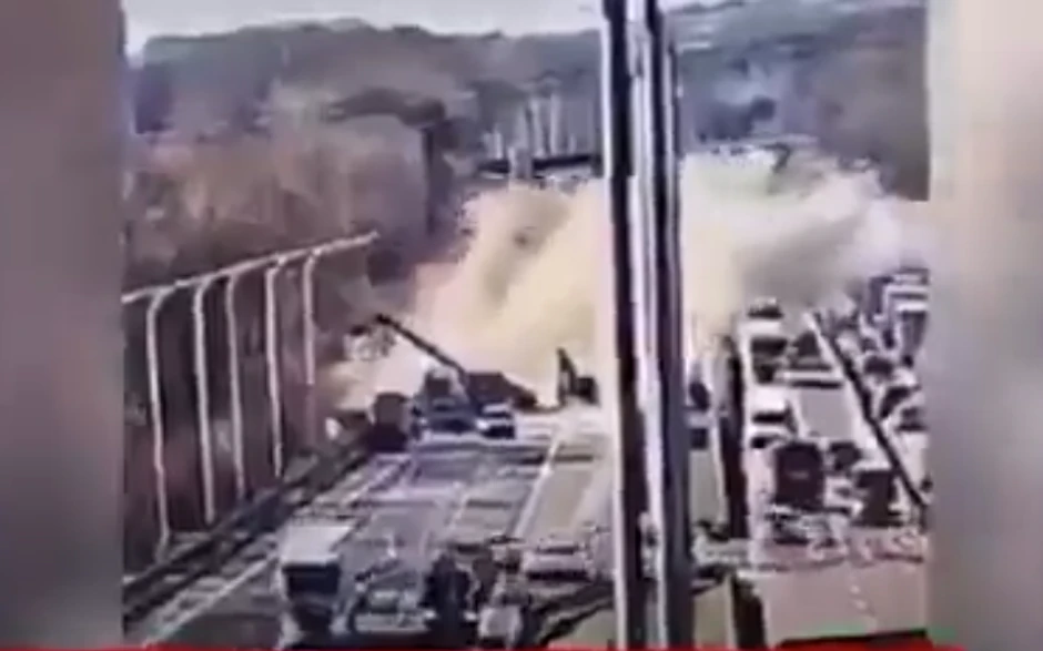 Pojavio se stravičan snimak momenta kada se urušio deo mosta. Na snimku se vidi kako se trotoar dela mosta urušava, povlačeći za sobom dve dizalice, dok se na drugom delu mosta saobraćaj i dalje odvija. Ogroman oblak prašine tada se podigao preko E42.
