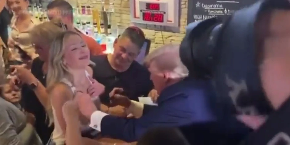 Osim što je razdraganoj masi delio pice, Tramp je stigao da usreći i jednu konobaricu. Naime, njoj se potpisao na gornji deo majice, a zatim i na podlakticu, dok je ona od sreće isplazila jezik.