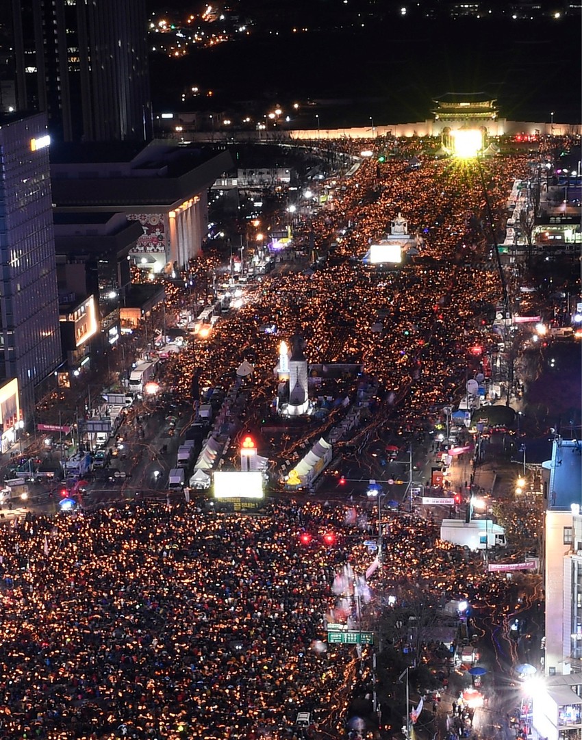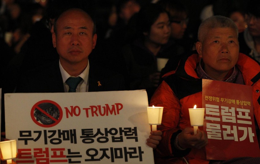 Južnokorejska dobrodošlica za Trampa nije bila u potpunosti slatka, s obzirom da se na seulskom trgu Gvangamun okupilo nekoliko desetina hiljada građana u znak protesta protiv američkog predsednika, s čijom politikom se očigledno ne slažu.