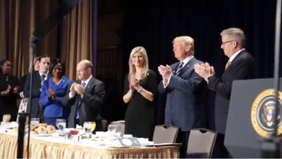 U 15-ominutnom obraćanju na godišnjem skupu zvaničnika drugih država, političara iz SAD, diplomata, verskih vođa, Tramp je ukazao da su osnivači Amerike govorili o "našem tvorcu" u Deklaraciji o nezavisnosti, da na američkom novcu piše "U Boga verujemo".