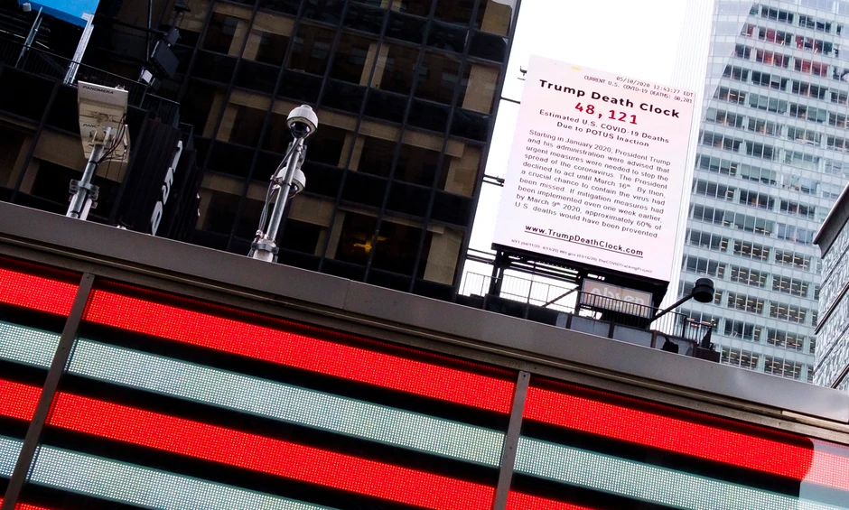 Na njujorškom Tajms skveru postavljen je "Trampov sat smrti", koji pokazuje broj smrtnih slučajeva od korona virusa u SAD, za koje autor krivi "nedelovanje predsednika Trampa".