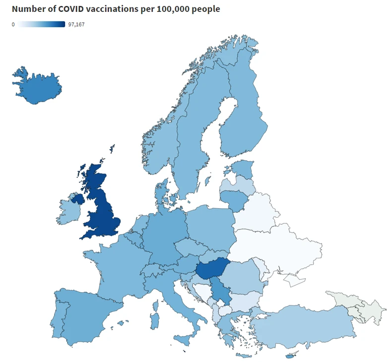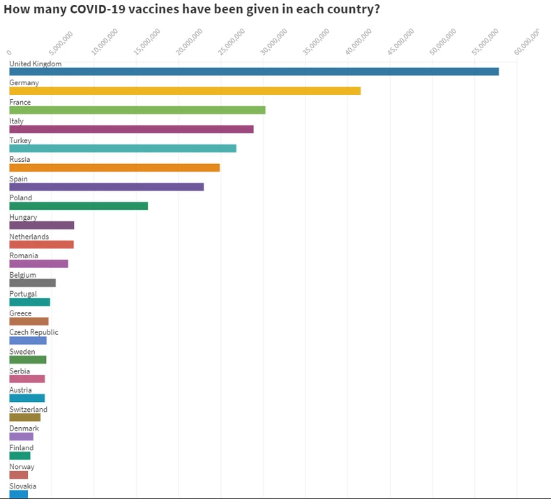 U pogledu apsolutnog broja datih vakcina zaključno sa četvrtkom, Velika Britanija, koja je sa imunizacijom počela skoro tri nedelje pre EU, ubedljivo vodi. U toj zemlji ukupno je dato 57.855.968 doza cepiva.