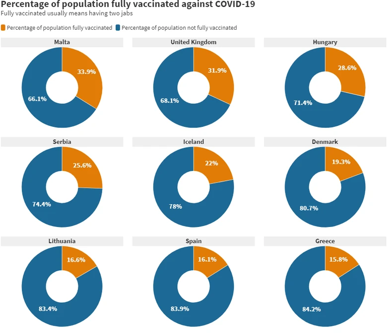 Nekoliko relativno siromašnih zemalja - prema standardima EU - počelo je sa vakcinacijom kasnije i obuhvatilo je manje ljudi. Spisak uključuje države poput Ukrajine, Moldavije, Albanije, Crne Gore i Belorusije.