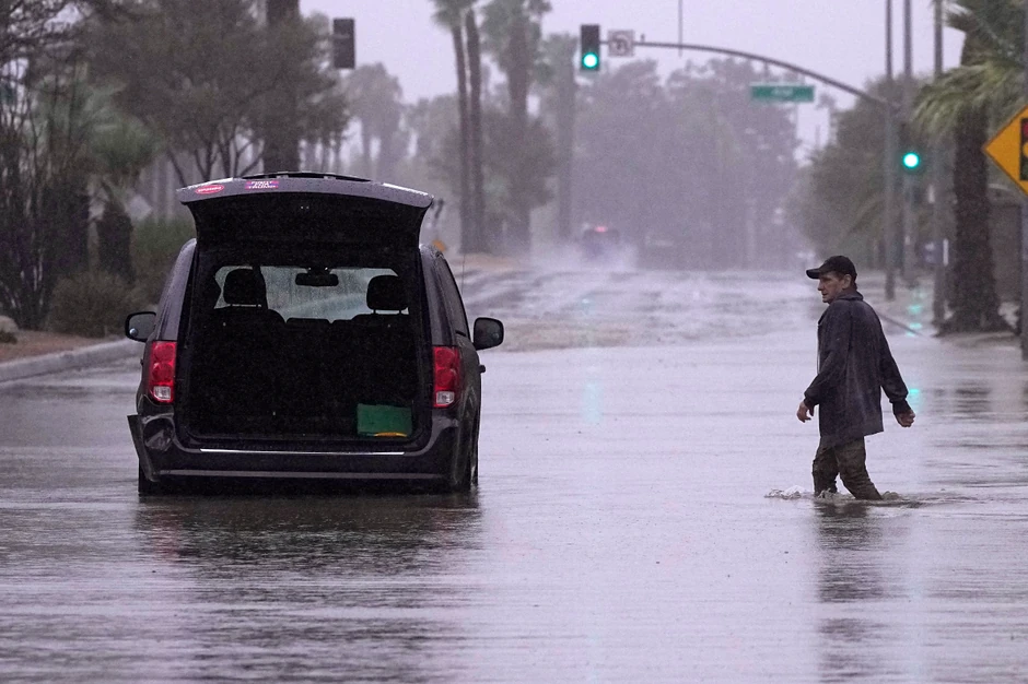 Spasioci su u pustinjskoj zajednici Katedral Sitija, u blizini Palm Springsa, krenuli buldožerom kroz blato do preplavljenog doma za starija lica i spasili 14 štićenika te ustanove, rekao je šef vatrogasne službe Majkl Kontreras.