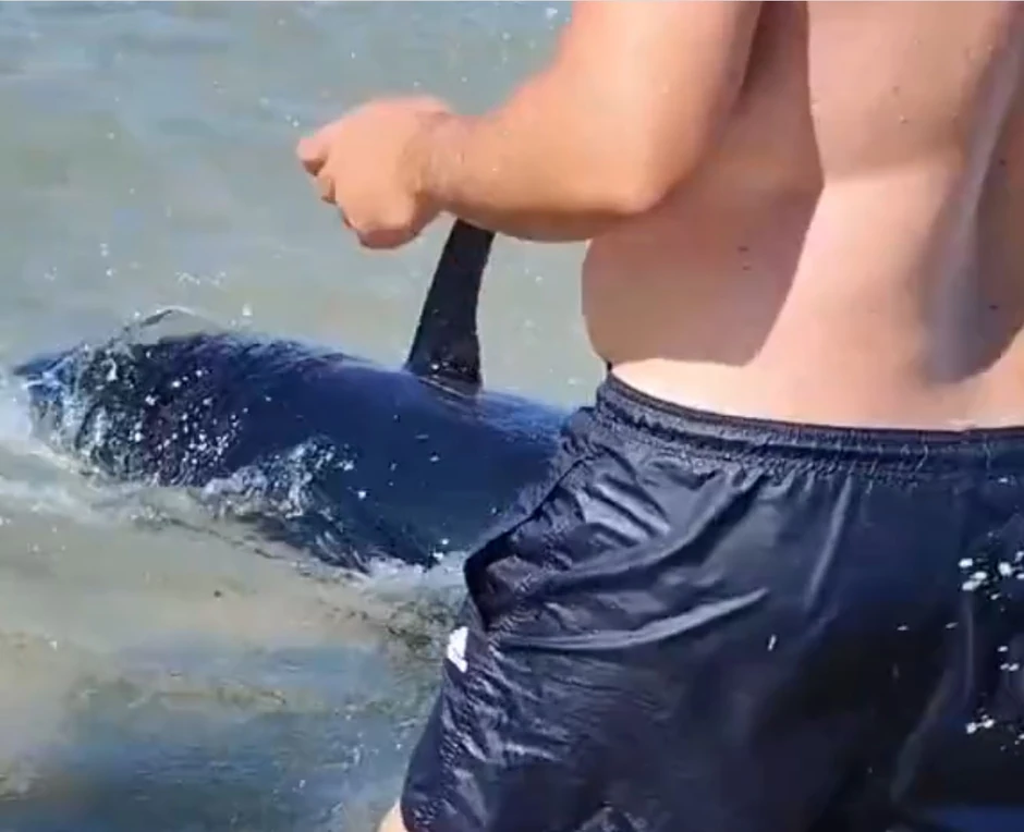 Uspaničeni kupači i posetioci ove plaže velikom brzinom su izašli iz vode, ali kada su shvatili da je zapravo reč o vrsti ribe - tuna, svi su prišli životinji i krenuli da je snimaju.