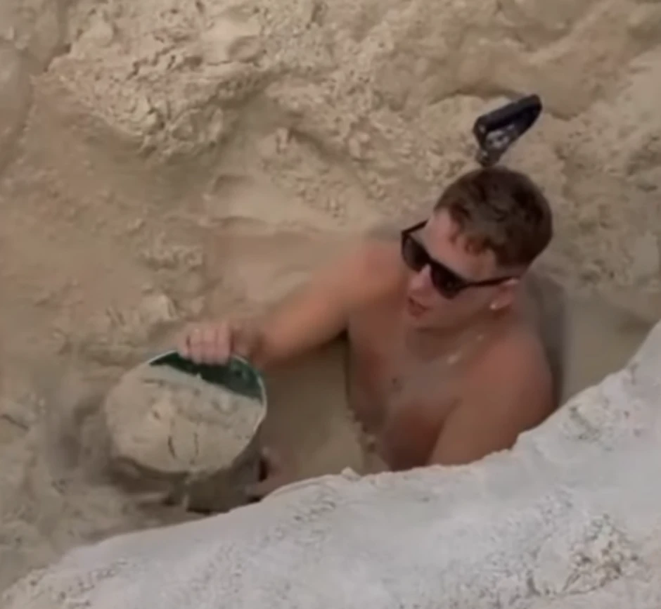 Mladić - zaposlen na aerodromu Getvik u Londonu - počeo je da kopa rupu dok su se njegovi prijatelji sunčali, a u jednom trenutku mu je čak zbunjeni radnik, koji se tu zatekao, dodao lopatu kako bi mogao da iskopa što dublju rupu. Međutim, kada je došao do dubine od oko dva i po metara - desio se peh! Pojavila se voda zbog čega se pesak urušio i zatrpao Britanca!