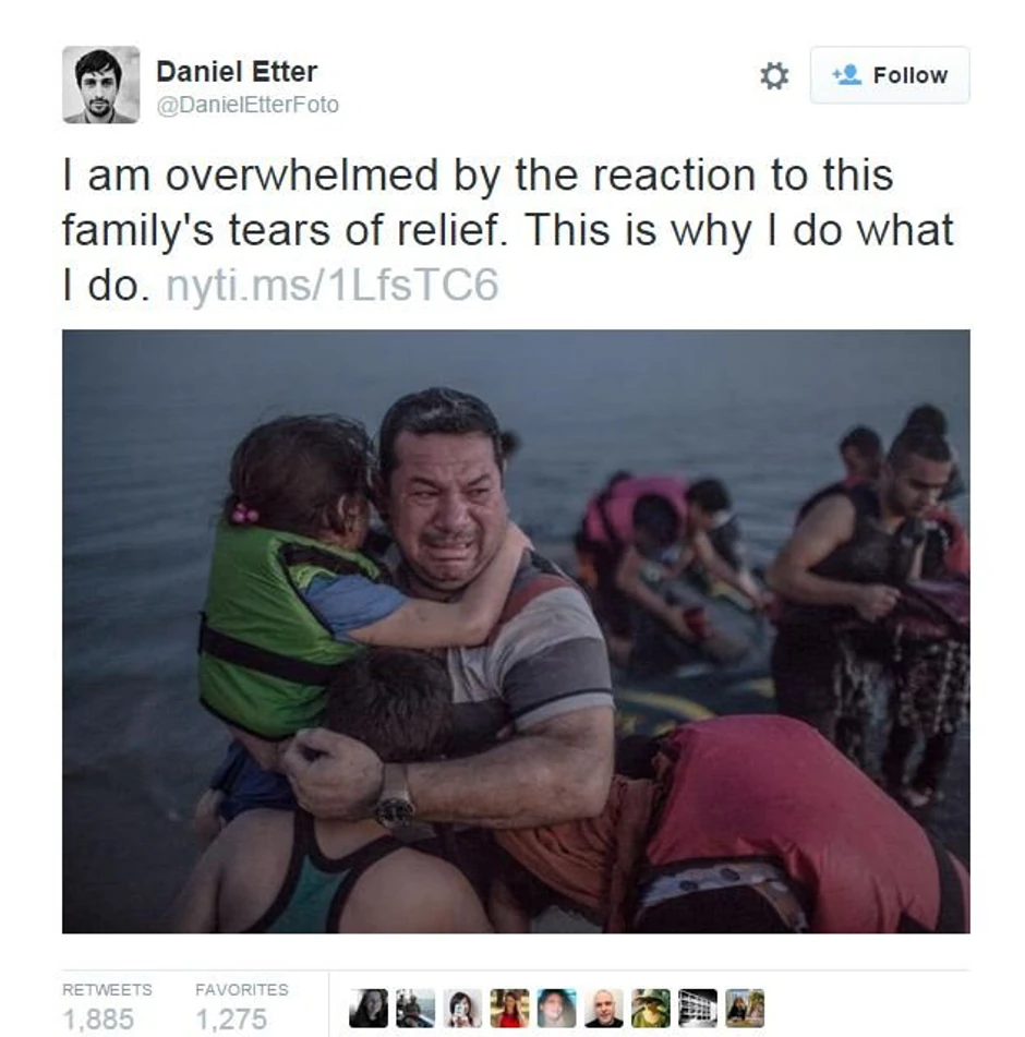 - U čamcu je bilo 12 ljudi, iako u tako mali čamac staje troje ili četvoro ljudi. Nakon više od dva sata vožnje čamac se izduvao, voda je počela da ulazi i izbeglice su bile potpuno mokre kada su stigle do obale. Tamo su osetili olakšanje što su se našli na bezbednom. U tom trenutku sve ih je obuzelo, sreća što su uspeli, ljubav prema porodici i tuga zbog onoga što se desilo - kazao je Eter za "Špigl onlajn".