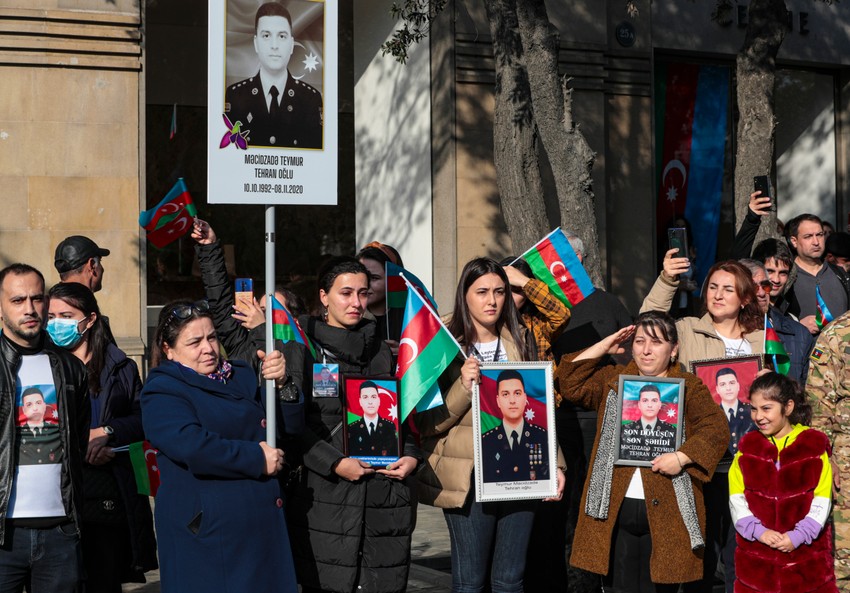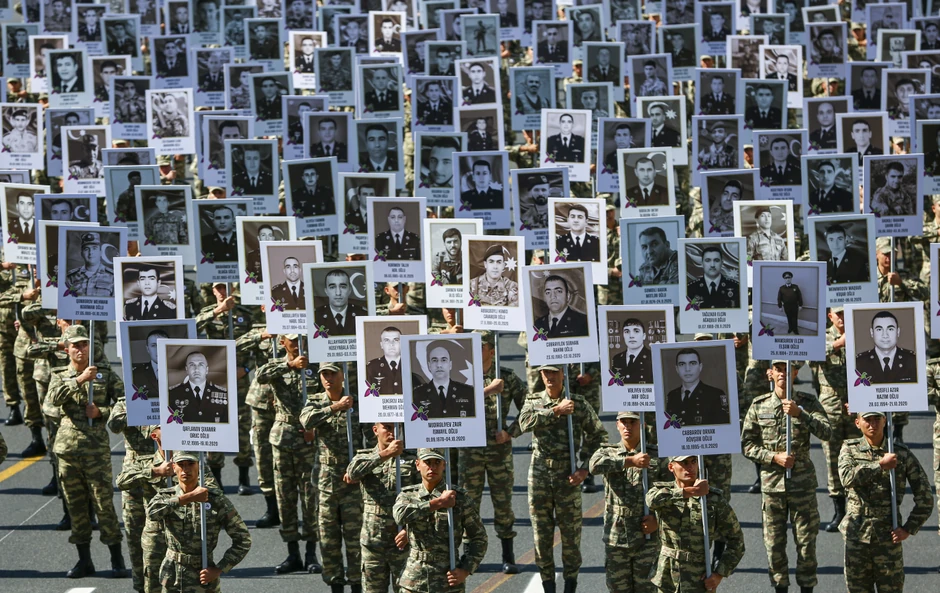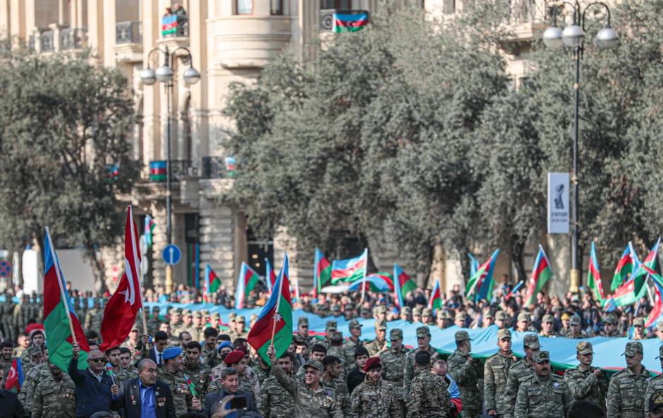 Desetine hiljada ljudi prodefilovale su kroz Baku, glavni grad Azerbejdžana da obeleže godinu dana od pobede u šestonedeljnom ratu sa Jermenijom u Nagorno-Karabahu.