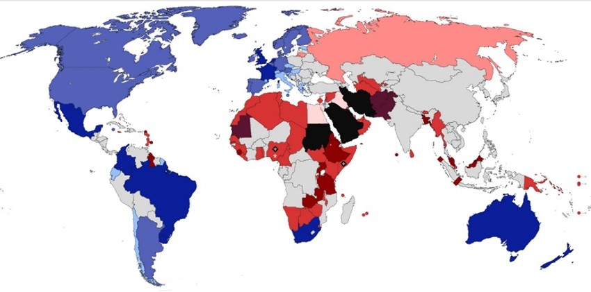 Na mapi iznad crna boja označava smrtnu kaznu, braon da postoji smrtna kazna ali da se ne primenjuje, tamnocrvena znači 14 godina zatvora do doživotne robije, crvena do 14 godina zatvora, ružičasta zabranjuje promovisanje homoseksualnosti, dok je svetloroza de fakto kriminalizacija.