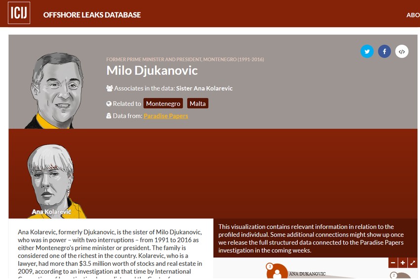 Kako se navodi na sajtu ICIJ Ana Kolarević, nekada Đukanović, sestra je Mila Đukanovića, koji je bio na vlasti od 1991. do 2016. godine, kao premijer ili predsednik Crne Gore. Porodica se smatra jednim od najbogatijih u zemlji, podseća ICIJ.