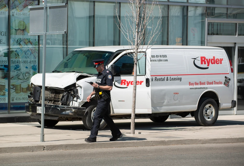 Policija je objavila da je beli kombi udario pešake raskrsnici ulice Jongi i Avenije Finč, a na televizijskim snimcima prikazano je ukazivanje pomoći povređenima koji leže na trotoaru.