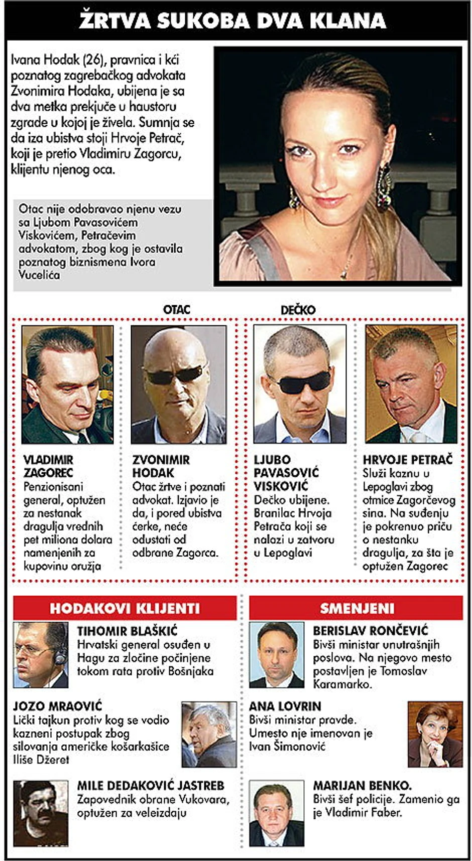 Ni dan posle brutalnog ubistva mlade pravnice Ivane Hodak, kćerke poznatog zagrebačkog advokata Zvonimira Hodaka, niko nije uhapšen niti postoje bilo kakve zvanične naznake o tome ko bi mogao da stoji iza njenog ubistva. Istovremeno, hrvatska vlada je pod ogromnim pritiskom javnosti i opozicije, čija je zajednička ocena da ova likvidacija nosi prepoznatljiv rukopis mafije i svedoči o eskalirajućem sukobu ratnih profitera u Hrvatskoj zbog podele krvavog plena stečenog tokom režima Franje Tuđmana.