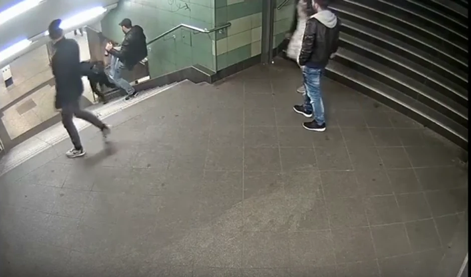 Kamera na stanici kod “Hermanštrasea” zabeležila je trenutak kada su četvorica muškaraca pratila mladu ženu niz stepenice, a zatim je jedan od njih, koji u jednoj ruci držao pivo, a u drugoj cigaretu, iznenada šutnuo ženu, koja je pala niz stepenice.