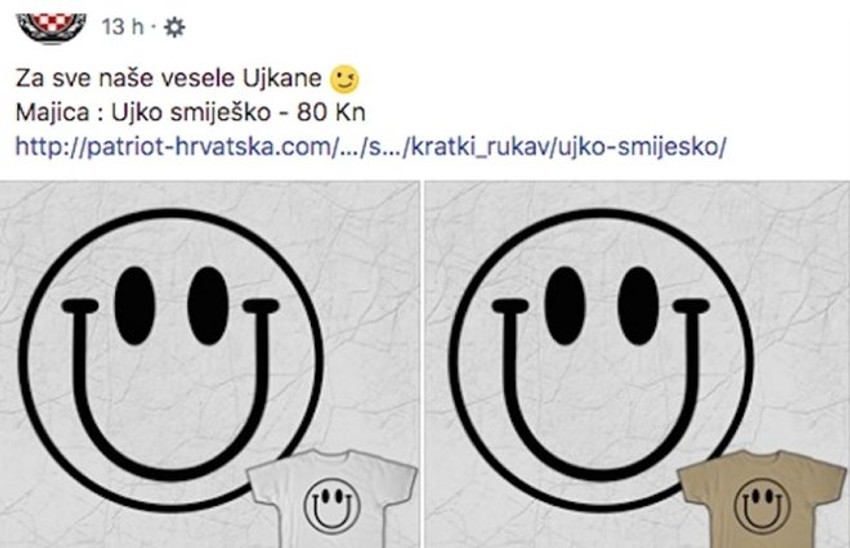 Majica "Ujko smiješko", s veselim smajlijem koji umesto usana ima ustaško "U", prodaje se u beloj i crnoj boji, a košta 80 kuna (1.270 dinara). Uz nju su, kao komentar, napisali: "Za sve naše vesele Ujkane ;-)".