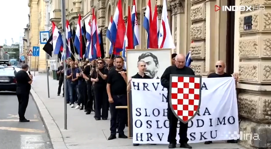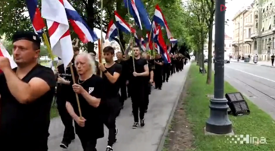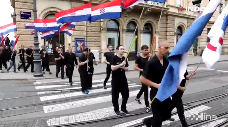 Grupa od dvadesetak simpatizera ekstremno desne Autohtone - Hrvatske stranke prava jutros je paradirala Zagrebom noseći zastave HOS-a i sa grbom na kome je prvo belo polje, a pojedini su imali majice sa ustaškim pozdravom "Za dom spremni".