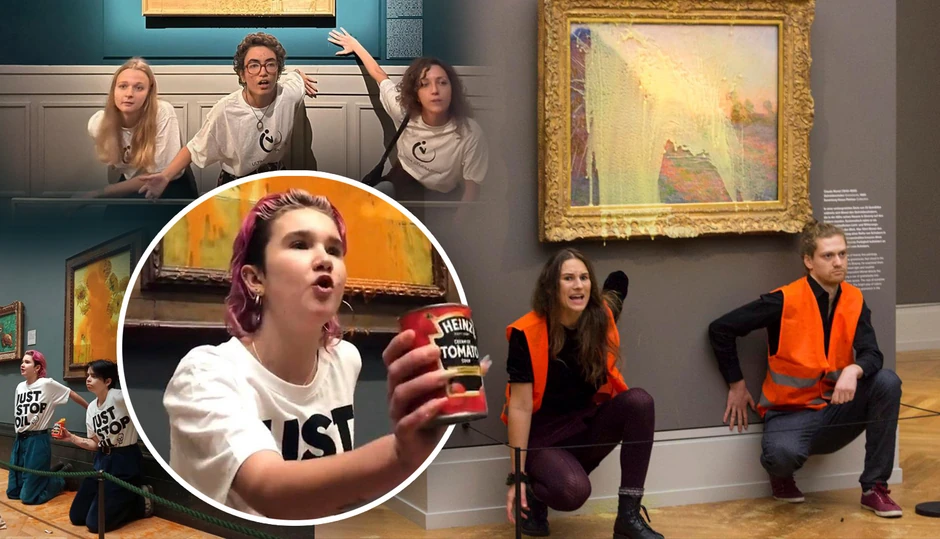 Trend je započeo u oktobru, kada je par aktivistkinja iz klimatske grupe „Zaustavite naftu“ (Just stop oil) 14. oktobra ušetao u Nacionalnu galeriju Ujedinjenog Kraljevstva i gađao čuvenu Van Gogovu sliku „Suncokreti“ konzervom supe od paradajza, pre nego što je zalepio ruke za zid ispod slike.