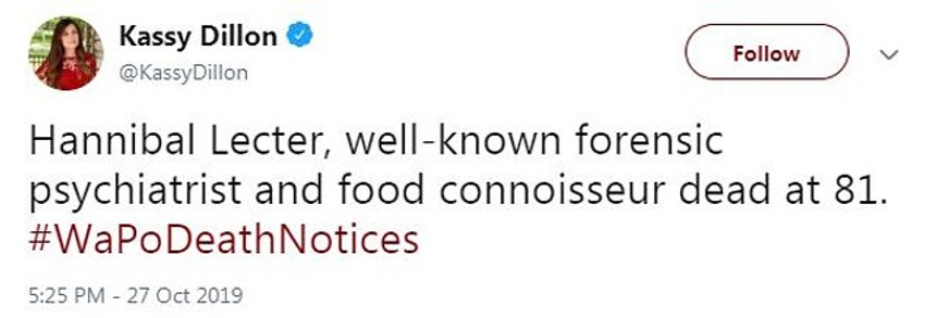 - Hanibal Lektor, čuveni forenzički psihijatar i poznavalac hrane, umro u 81. godini.
