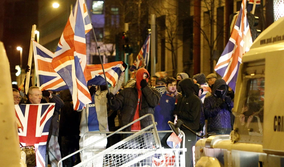 Više od 1.000 protestanata, od kojih su mnogi nosili britansku zastavu, sukobili su se s policijom nakon što su nacionalistički poslanici Šin Fejna i SDLP-a izglasali da se sa vrha zgrade ukloni zastava Ujedinjenog Kraljevstva, koja se odatle viorila od otvaranja većnice 1906. godine.