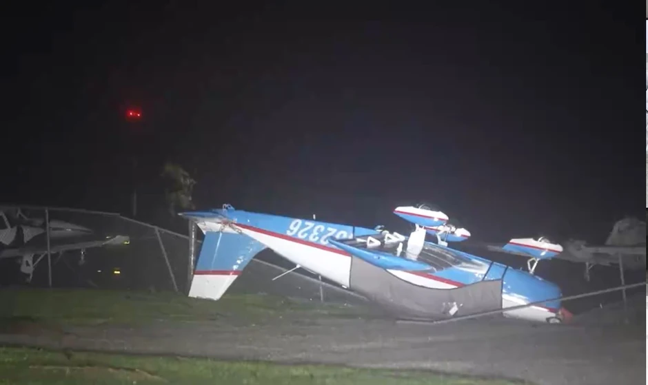 Snimak prikazuje mali avion koji je, po svemu sudeći, prevrnuo jak vetar.