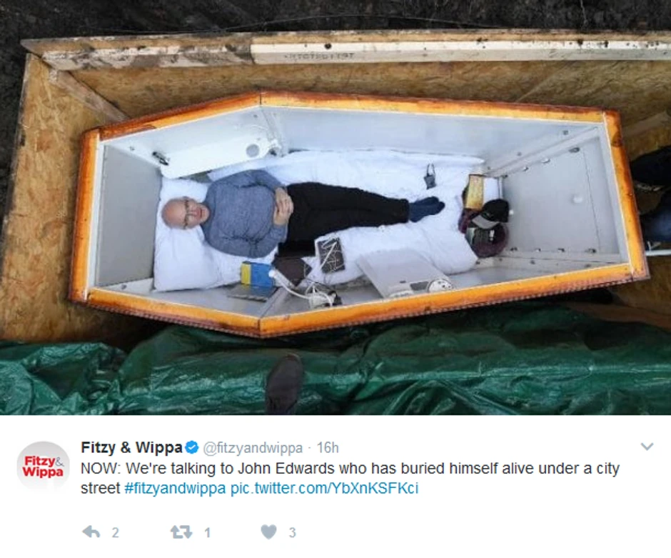 Za većinu ljudi, ideja da bi mogli da budu živi sahranjeni, prava je noćna mora. Džon Edvards nema taj problem. On je sam odlučio da provede tri dana i tri noći ispod zemlje, zakopan u sanduku koji liči na mrtvački.