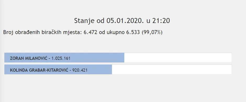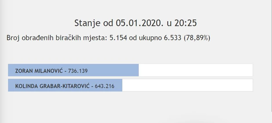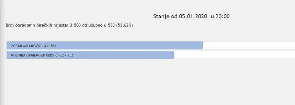 Od trenutnog broja prebrojanih glasova (53,62 odsto), Milanović je dobio 431.861 glas, dok je Kolinda Grabar Kitarović dobila 367.752 glasova.