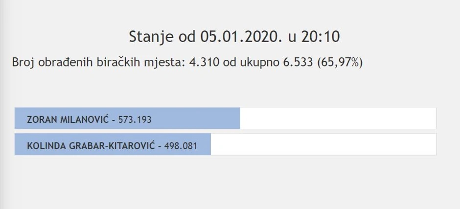 DIP je objavio nove rezultate na uzorku od 65,97 odsto obrađenih glasova prema kojima je Milanović je osvojio 573.193, a Kolinda Grabar Kitarović 498.081.