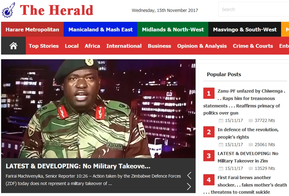 Državni list Zimbabvea "Herald" posle višečasovne tišine objavio je danas na naslovnoj strani sajta da u toj zemlji "nije bilo vojnog preuzimanja vlasti" od predsednika Roberta Mugabea, dok opozicija tvrdi da smenjeni potpredsednik Emerson Mnangagva stoji iza akcije vojske i da će se "veoma brzo čuti da se Mugabe povlači iz političkog života".
