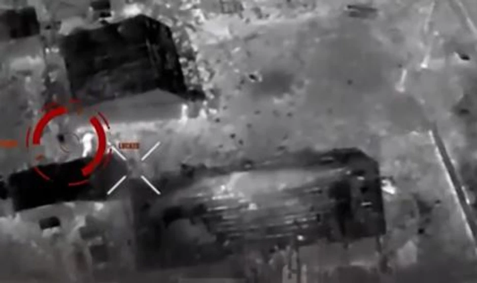Kopneno vozilo se zaustavlja, sa jasnim pogledom na ruskog vojnika. Snimak iz vazduha beleži nekoliko bljeskova iz cevi mitraljeza. Robot puca i čini se da pogađa vojnika dva puta.