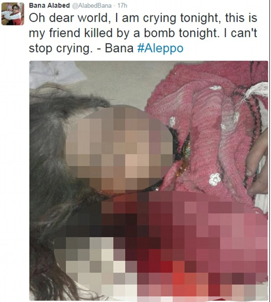 "Dragi svete, noćas plačem. Ovo je moja drugarica koju su noćas ubile bombe. Ne mogu da prestanem da plačem", podelila je Bana Alabed svoju bol s pratiocima na Tviteru.