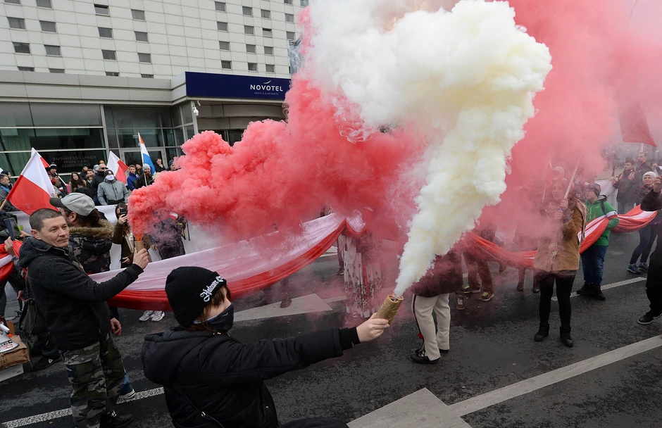 Učesnici su palili baklje i pucali petarde stvarajući oblak dima u beloj i crvenoj boji koje čine poljsku nacionalnu zastavu.