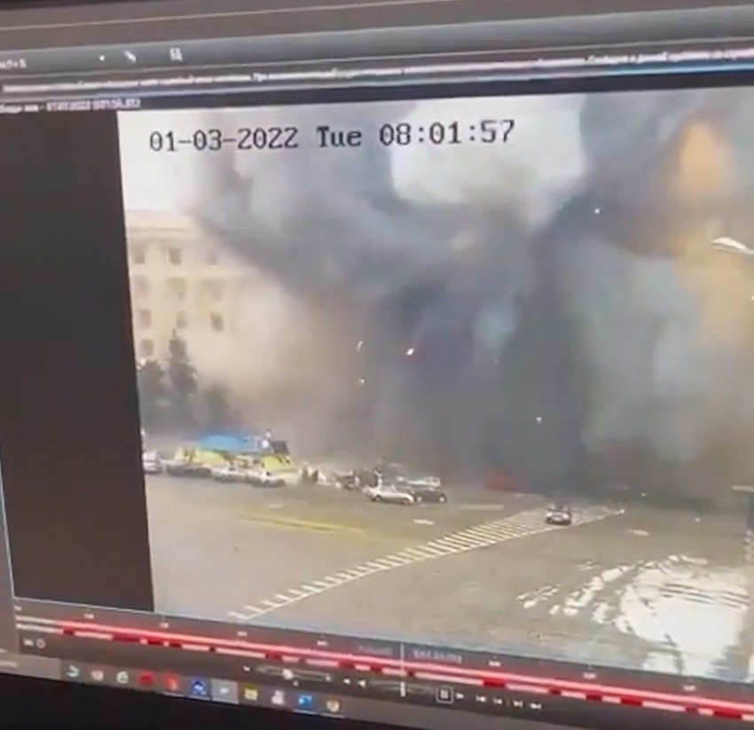 "Stratkom centar" je na "Tviteru" uz snimak naveo da je u pitanju "napad projektila na regionalnu administraciju Harkova" i da se granatiraju stambena naselja "gradom".