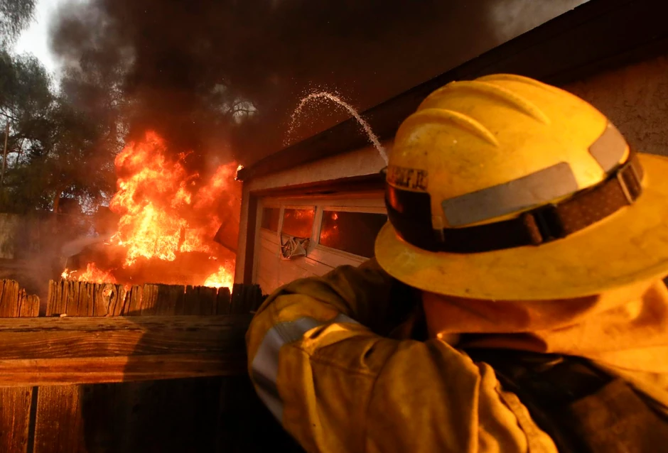U borbi protiv požara u Kaliforniji od opekotina i udisanja dima poginuo jedan vatrogasac, a vrtoglavi vetrovi navode požar ka ekskluzivnom naselju Montesito gde stanuju poznate ličnosti Opra Vinfri, Elen Dedženeris i mnogi drugi.