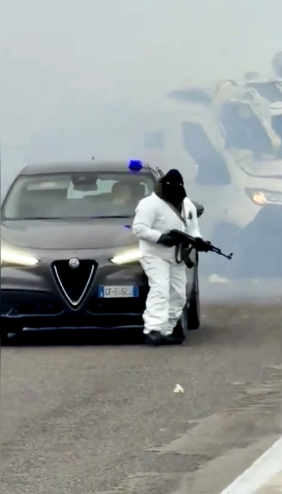 Na video-snimku italijanske "Republike" objavljenom na društvenoj mreži "Iks" (X), vide se maskirani muškarci naoružani kalašnjikovima - od kojih su neki bili u belim kombinezonima i za koje se veruje da su članovi bande - kako ulaze u obračun sa karabinjerima.