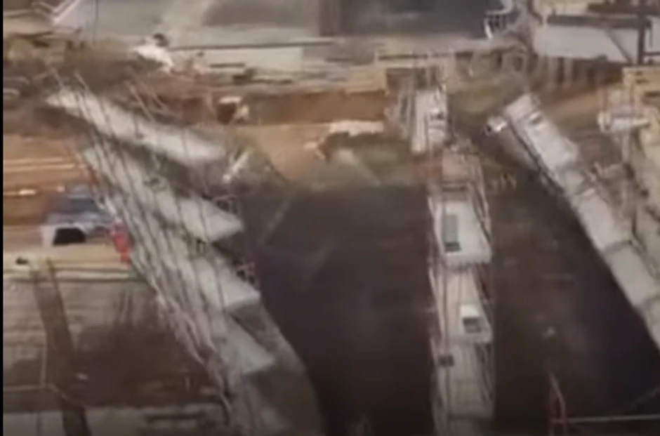 Na snimku se vidi kako su radnici pokušali da održe konstrukciju uspravno postavljajući čelične cevi neposredno pre urušavanja, a kran na gradilištu je takođe pomogao u njenoj stabilizaciji. Međutim kada je konstrukcija krenula da pada, radnici su uspeli da izbegnu smrt za dlaku i pobegnu u stranu.