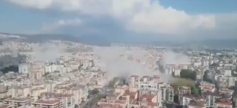 Na panoramskim snimcima vide se gusti oblaci dima na nekoliko mesta u Izmiru gde su, kako se čini, srušene zgrade.