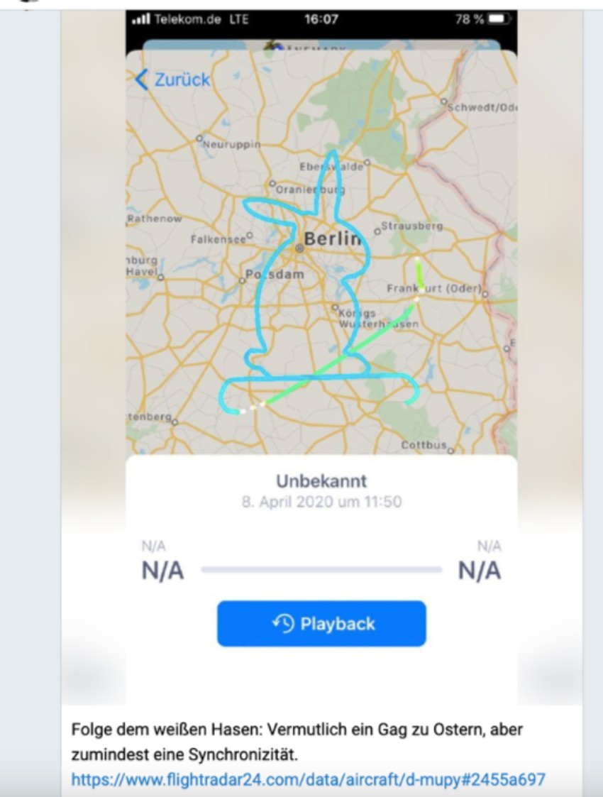 Ovaj let se dogodio kada je pilot preleteo iznad Berlina kako bi napravio oblik zeca neposredno pre Uskrsa u aprilu 2020. Iako je priznao da je ovo „verovatno uskršnja šala“, Nemac koji je podelio sliku započeo je svoj post sloganom: „Prati belog zeca.” Prema njegovim rečima , oblik zeca je bio „barem sinhronicitet“.