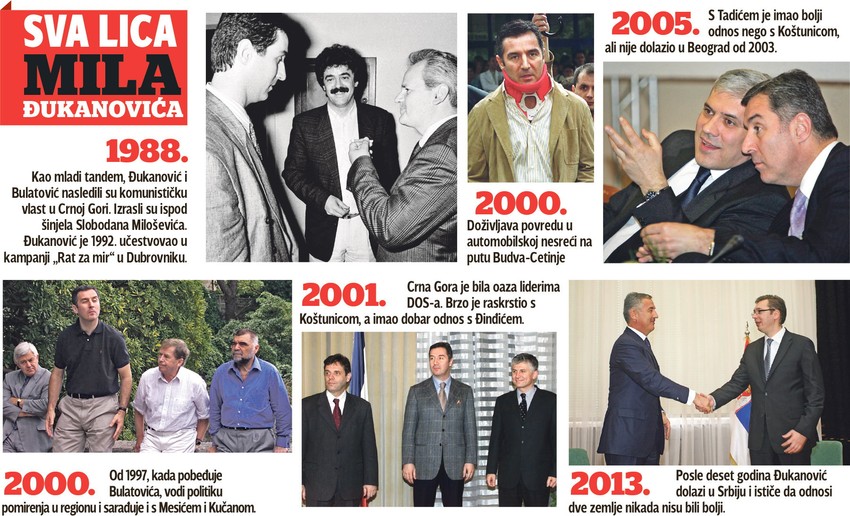 U Srbiji su se na vlasti smenjivali i nacionalisti i desnica i građanska opcija i levica. Milo Đukanović je sve to bio u različitim epohama. I tu zemlju, kao i sve u regionu, muče i kriminal i siromaštvo, ali narod uporno bira njega. Bio je dobar s Miloševićem, pa njegov najveći protivnik. Koštunicu je nazvao “Miloševićem u leptir-mašni”. S Tadićem se nije slagao, a najbolje odnose gaji s Vučićem.