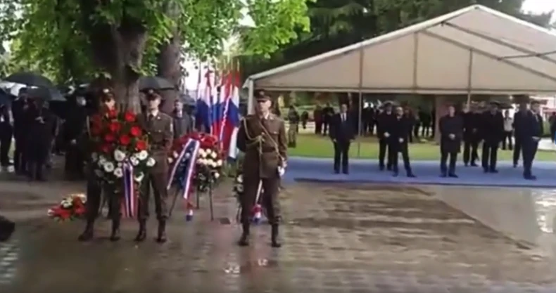 U Okučanima na današnjem obeležavanju godišnjice hrvatske vojno-policijske akcije Bljesak, nisu bile samo majice sa grbom HOS-a, čiji je simbol "Za dom spremni", već i venac sa tim ustaškim pozdravom.