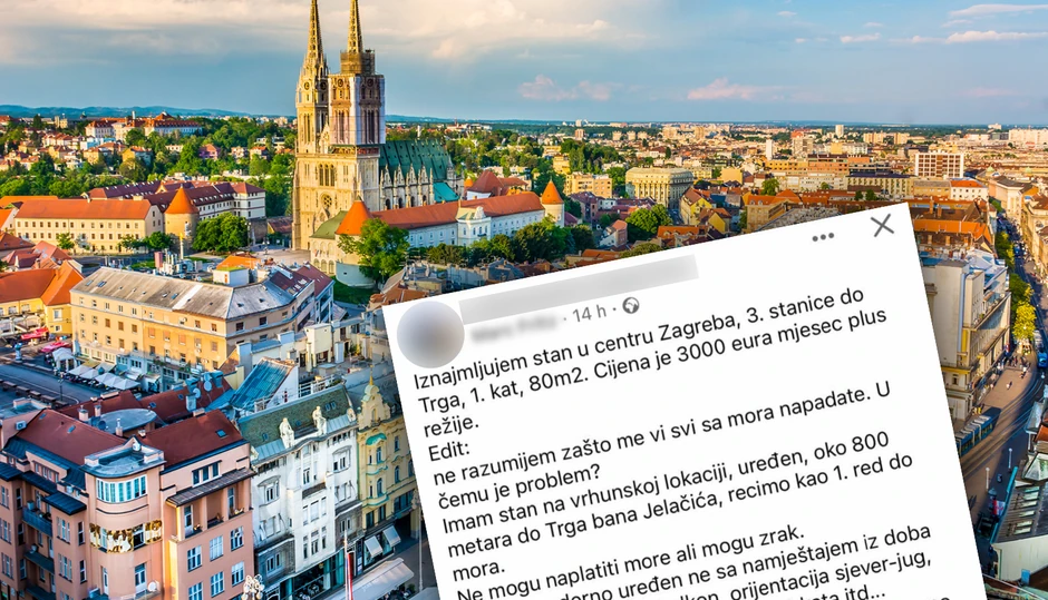Jedan Zagrepčanin izazvao je lavinu komentara oglasom u Fejsbuk grupi Apartmani Hrvatska u kojem se većinom iznajmljuju apartmani na hrvatskoj obali. Naime, objavio je kako iznajmljuje stan u centru Zagreba, tri stanice do Trga bana Josipa Jelačića na prvom spratu, veličine 80 metara kvadratnih. Ništa ne bi bilo neobično da nije transparentno napisao cenu - 3.000 evra za mesec dana plus režije.