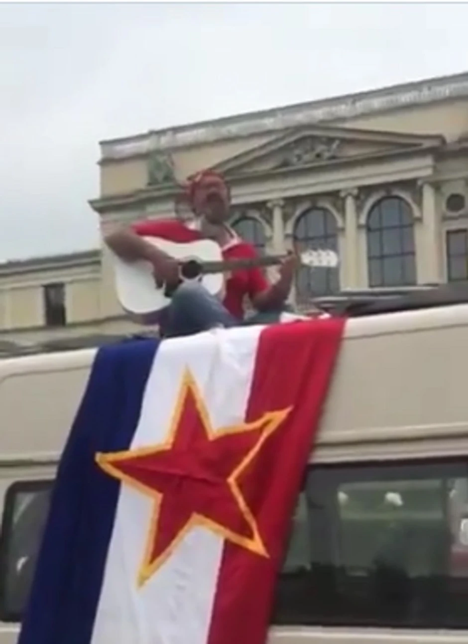 Muškarac sa gitarom seo je na zastavu SFRJ sa petokrakom postavljenu na vrh kombija ispred muzeja i zapevao, javila je producentkinja televizije sa lica mesta.