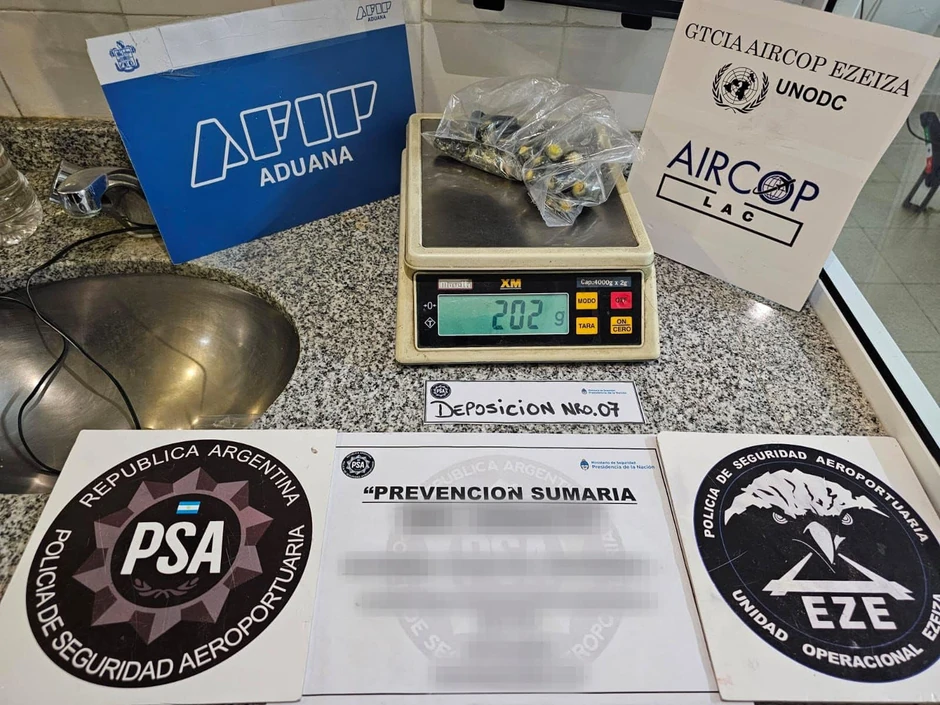 Dvadesetogodišnja žena uhapšena je na međunarodnom aerodromu "Ministro Pistarini" u Buenos Ajresu u Argentini nakon što su aerodromske vlasti otkrile da je žena pokušala da prokrijumčari drogu u Evropu. Istražitelji su u njenom telu pronašli ukupno 78 kesica punih kokaina: 67 je bilo zaglavljeno u stomaku, dok je još jedanaest ubacila u svoju vaginu.