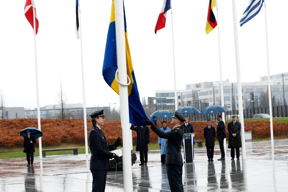 Zastava Švedske podignuta je danas ispred sedišta NATO-a u Briselu uz intoniranje državne himne, nakon zajedničke konferencije za medije švedskog premijera Ulfa Kristersona i generalnog sekretara Alijanse Jensa Stoltenberga.