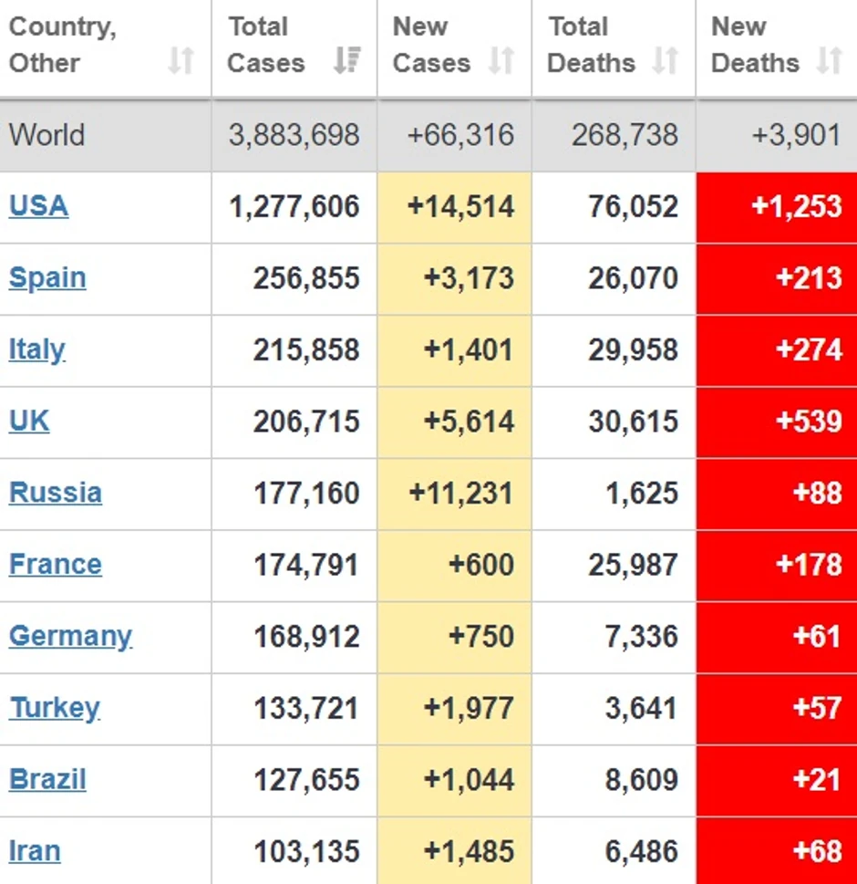 U Engleskoj je broj preminulih porastao za 383 na ukupno 22.432. U Škotskoj je broj preminulih porastao za 59 na ukupno 1.762. U Velsu je preminulo još 18 osoba čime je ukupan broj smrtnih slučajeva porastao na 1.062.