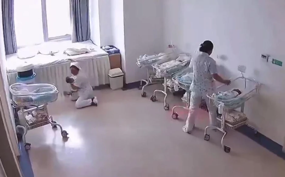 Na snimku se vidi kako jedna medicinska sestra za vreme snažnog zemljotresa sedi na podu sa bebom u rukama, a druga pokušava da pridržava krevetiće na točkiće sa novorođenčadi u njima.