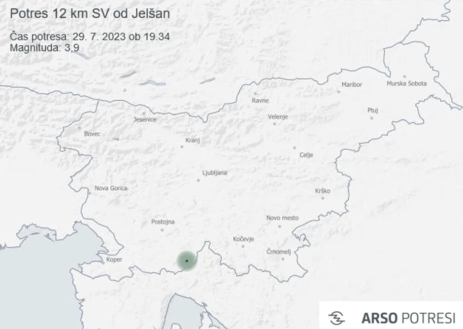 Seizmografi slovenske Državne mreže seizmičkih opservatorija u 19:34 sati zabilježili su potres magnitude 3,9 stupnjeva. Prema prvim podacima, epicentar potresa bio je 12 kilometara severoistočno od Jelšana, javlja Agencija za zaštitu okoline, a prenosi RTV Slo.