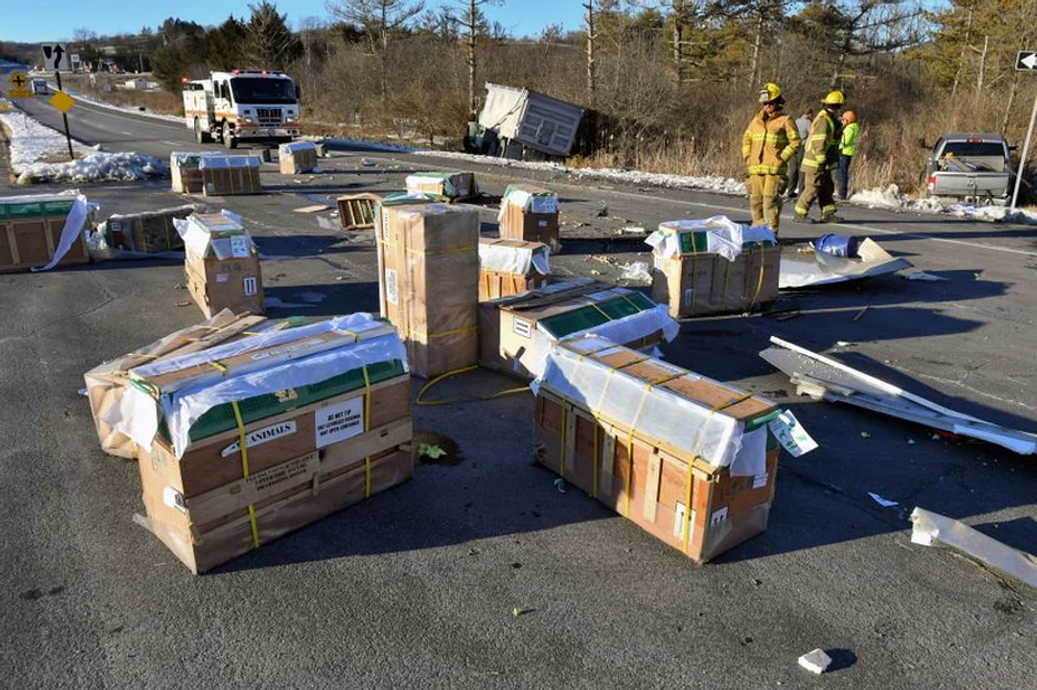Prema pisanju medija, Mišel Falon je vozila iza kamiona kada se slupao, nakon čega su sanduci sa životinjama pali nasred auto-puta.