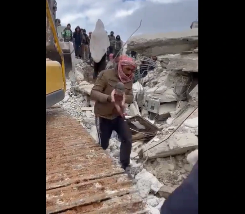 Potresan video koji je objavljen na društvenim mrežama pokazao je srceparajući trenutak kada je novorođenče spaseno ispod ruševina srušene sirijske zgrade nekoliko minuta nakon rođenja.